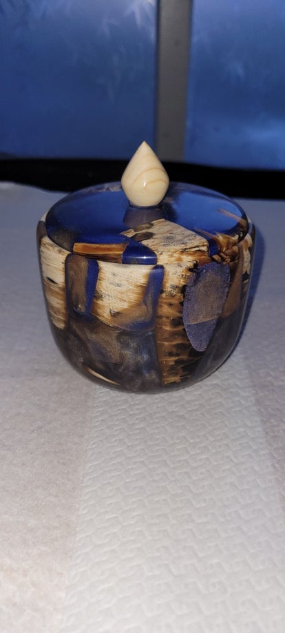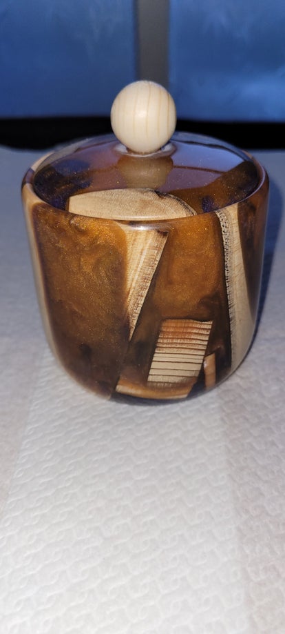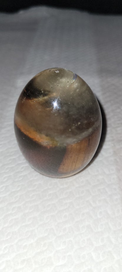 Hand gemaakt, kleuren kunnen iets afwijken van de foto. Bol is van epoxy de voet is Teakhout. Ornamenten zijn uniek er is geen tweede van.