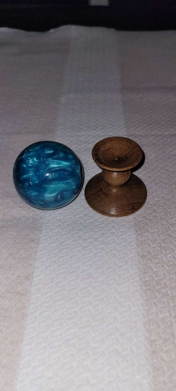 Hand gemaakt, kleuren kunnen iets afwijken van de foto. Bol is van epoxy de voet is Teakhout. Ornamenten zijn uniek er is geen tweede van.